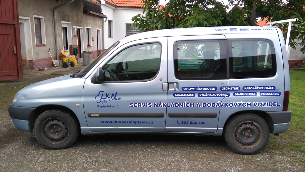 Grafický návrh a polep vozu Citroën Berlingo pro LKW servis Plzeň řezanou grafikou.