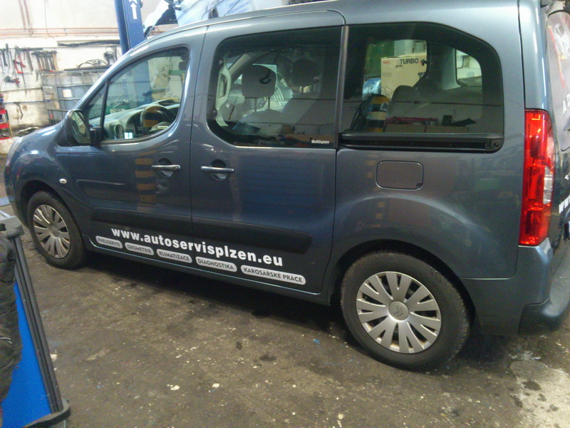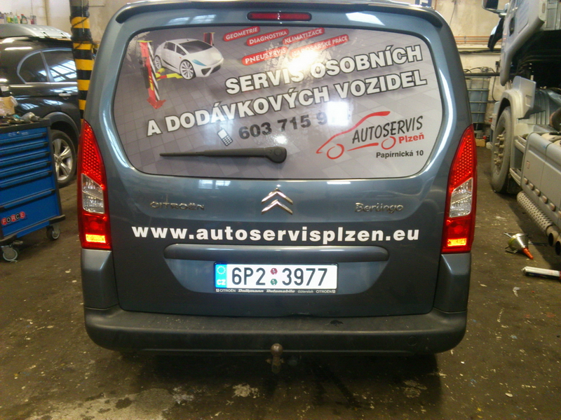 Grafický návrh a polep vozu Citroën Berlingo firmy Autoservis Plzeň, řezanou grafikou a zadní okno fólií one way vision pro reklamu na vnější ploše okna, ale bezproblémový výhled ven z vozu.