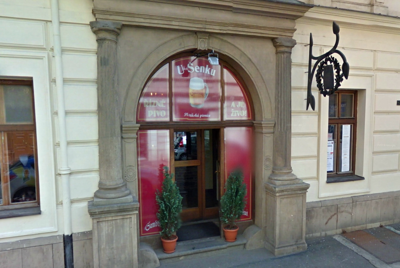 Grafický návrh a polep prosklených vchodových dveří restaurace U Šenku, fólií one way vision pro reklamu a změnu vzhledu vchodu z pohledu z ulice, ale bezproblémový výhled ven z restaurace.